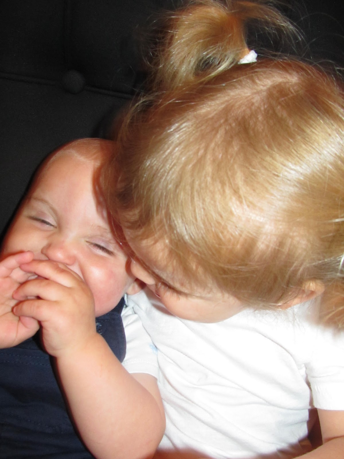 I said to Andrew in the car the other day that Hannah is a born teacher, meaning that I can already see an innate desire in her to teach. For months she has been trying to teach Ethan to clap, sing, and even walk (he has finally learned that one). Hannah heard us talking and she said loudly ``Hannah no teacher, Hannah is Hannah``. Despite her assertions you can see it the way she interacts with Ethan and it makes Andrew and I laugh.